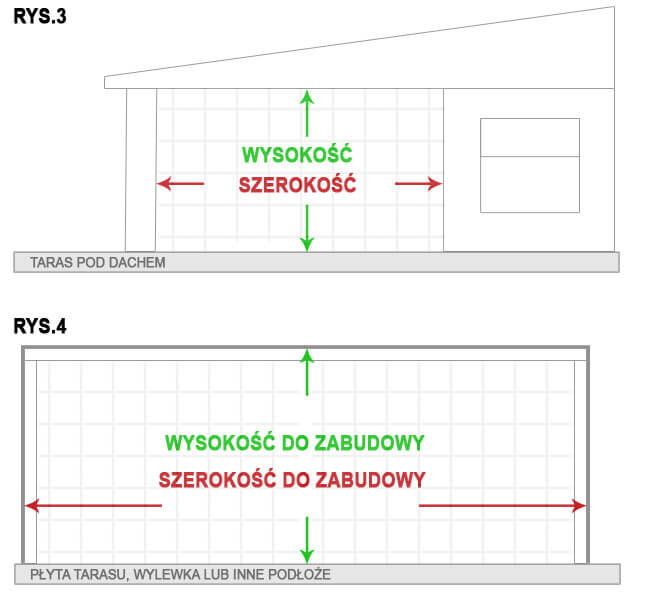 W tym przypadku w kalkulatorze podajemy SZEROKOŚĆ i WYSOKOŚĆ do kalkulatora mierząc przestrzeń do zabudowy np. od ściany do ściany (rys.3) lub dowolną przestrzeń (rys.4)