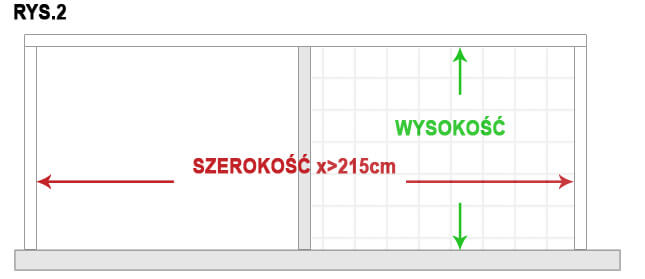 Dla SZEROKOŚCI > 215cm przestrzeń należy przedzielić własnym słupkiem dzielącym. W tym przypadku do kalkulatora należy wpisać szerokość przestrzeni, które powstały w wyniku podziału słupkiem mierząc światło pomiędzy słupkami.