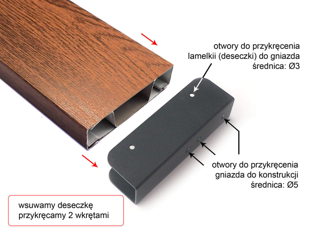 Gniazdo montażowe dedykowane dla profilu stalowego o wymiarach 103×23 mm. Element ten umożliwia szybki i stabilny montaż lameli stalowych, blaszanych lub aluminiowych w rozmiarze 103×23 mm. W pełni kompatybilne z systemem lameli Blach-Met, zapewnia trwałe i estetyczne połączenie z konstrukcją.