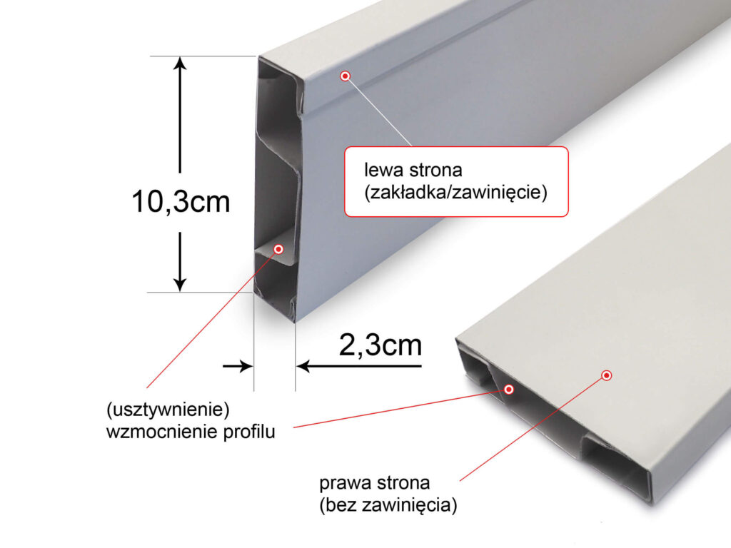 Solidny profil stalowy o wymiarach 103×23 mm wykonany jest z wysokiej jakości blachy stalowej pokrytej nowoczesną powłoką antykorozyjną. Zamknięty kształt profilu, w połączeniu z wewnętrznym wypełnieniem usztywniającym, zapewnia wyjątkową sztywność i odporność na odkształcenia.