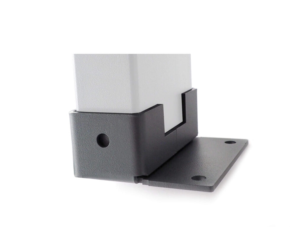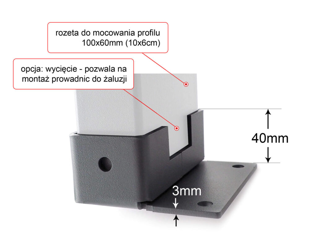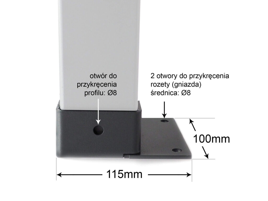 Rozeta montażowa na profil o wymiarze 100x60mm. Potocznie nazywana mocowaniem przyściennym gdyż posiada jedną stopę z dwoma otworami montażowymi. Element ten umożliwia szybki i stabilny montaż profili stalowych jak również kantówki drewnianej. Doskonale zabezpieczona przed użytkowaniem na zewnątrz w warunkach atmosferycznych. Zapewnia trwałe i estetyczne połączenie z konstrukcją.